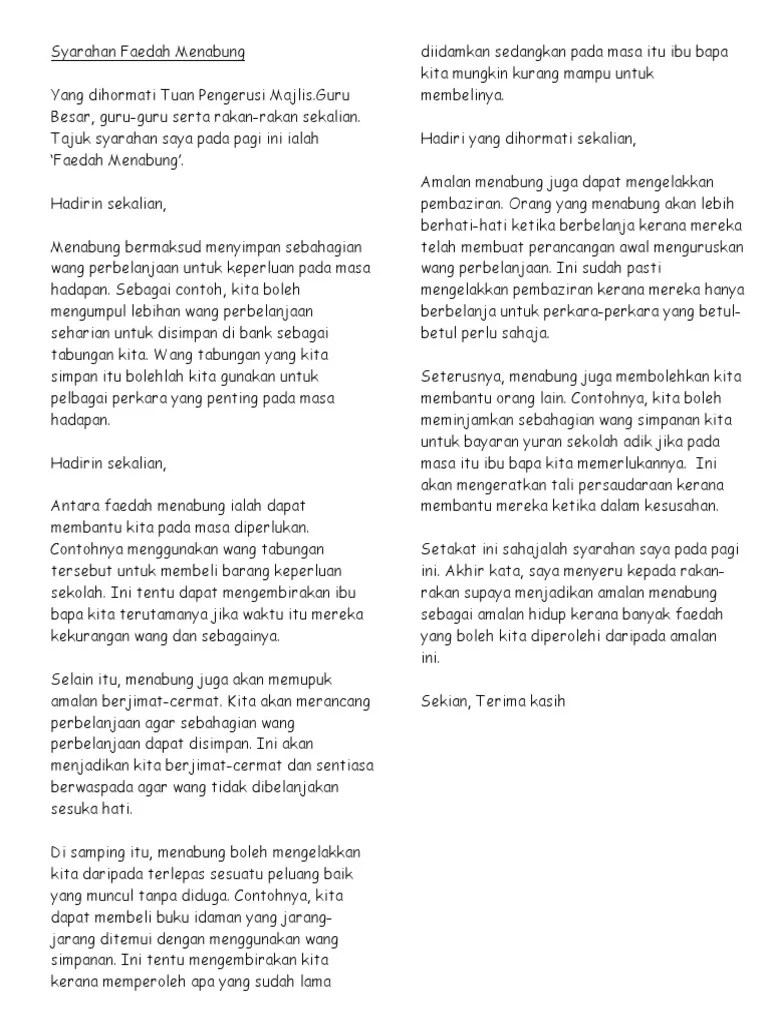 Contoh karangan kepentingan amalan menabung dan menyimpan wang. Oleh itu, amalan menabung boleh dikatakan membawa faedah yang banyak kepada .